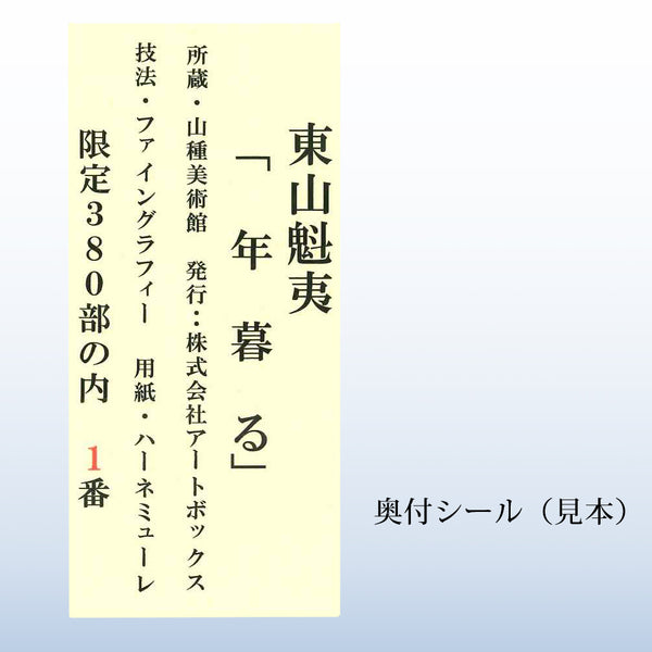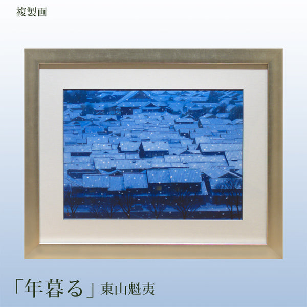 東山魁夷の京洛四季の一作《年暮る》。青の階調で表された本作を合計8色のインクにより、原画の色のみならず作品のタッチや凹凸感を含めた微妙なニュアンスを忠実に再現しています。 大晦日の京都を叙情豊かに表現し、しんしんと降り積もる雪の音や、厳かに鳴り響く除夜の鐘が聞こえてくるようです。